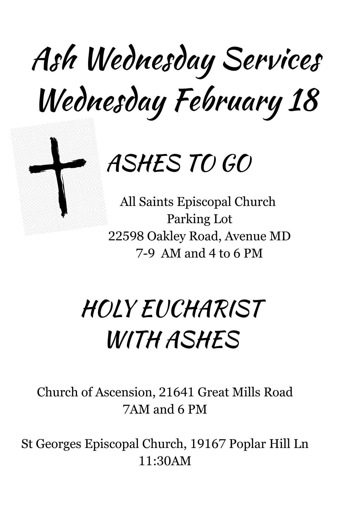 Join us on February 18 in the morning between 7 and 9 or in the afternoon between 4 and 6. Deacon Joan will be in the parking lot of All Saints Church. You are also welcome to attend services on the 18th at 7 am or 7 pm at Church of the Ascension in Lexington Park, or at 11:30 am at St. George's Episcopal Church in Valley Lee.